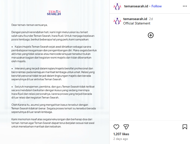 Di tengah ramainya pembahasan, komunitas kajian Teman Searah akhirnya merilis pernyataan klarifikasi secara terbuka melalui akun resmi Instagram mereka. Klarifikasi ini bertujuan memberikan penjelasan terkait tuduhan yang mengaitkan kegiatan kajian dengan relasi personal para pendirinya.